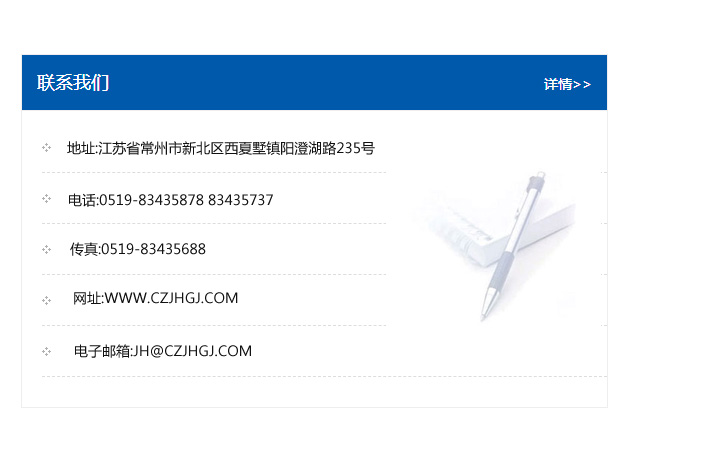 傳真:0519-83435688    郵編:213135    網址:WWW.czjhgj_com.shenshi-tie.com    電子郵箱:JH@czjhgj_com.shenshi-tie.com